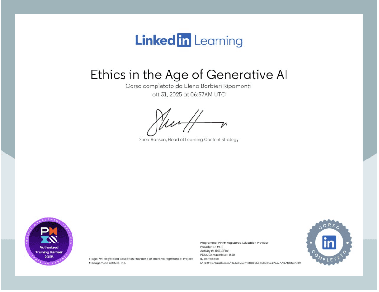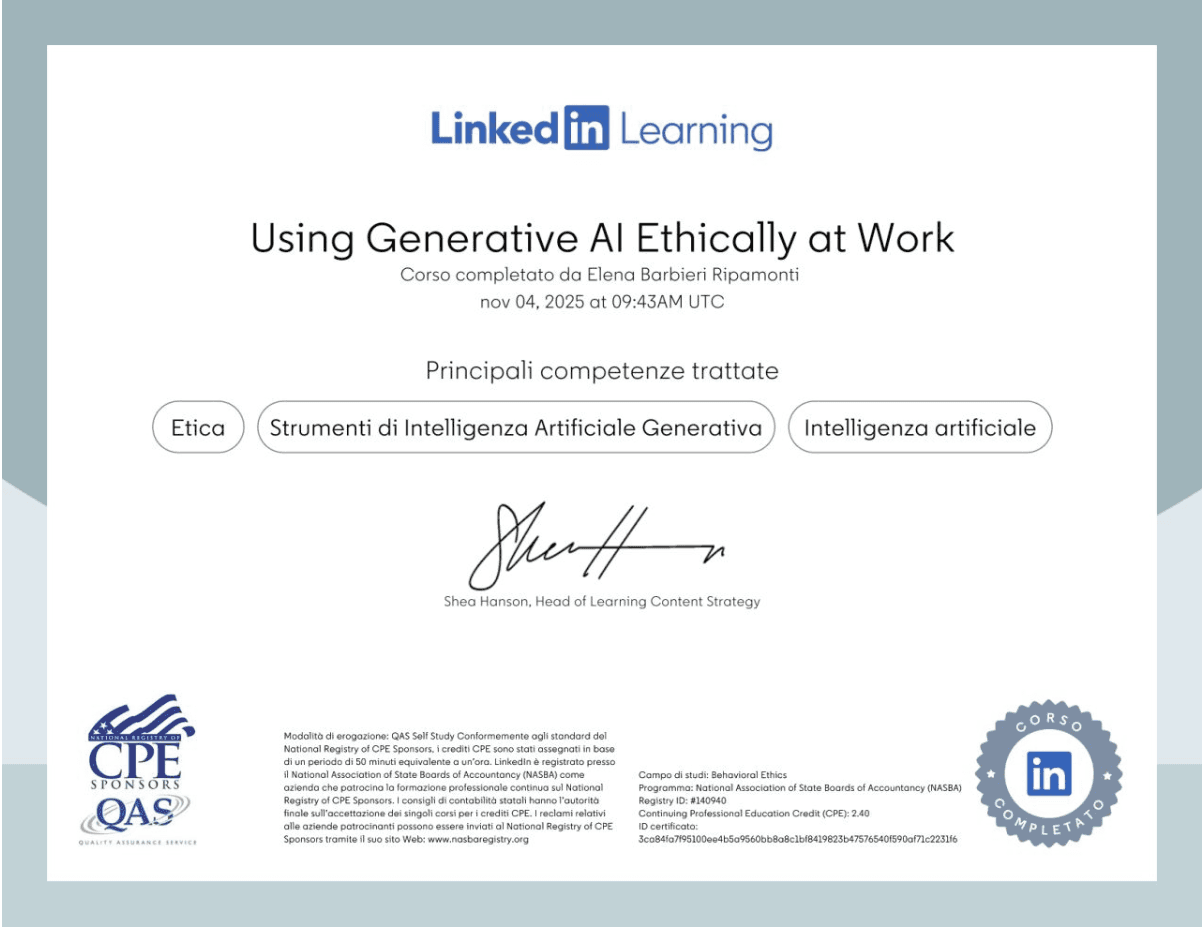 Il mio obiettivo non è insegnare “come usare uno strumento”, ma aiutare le persone a sviluppare competenze e senso critico per utilizzare l’AI in modo consapevole e autonomo.Lavoro come ponte tra tecnologia e organizzazione: traduco modelli complessi in pratiche comprensibili, collegando l’AI ai flussi di lavoro, alle decisioni quotidiane e alle relazioni professionali in cui viene inserita.
